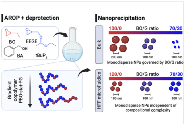 The self-assembly of amphiphilic copolymers into well-defined nanoparticles depends on the interplay among polymer composition, solvent exchange kinetics, and processing conditions. In this study, we explore the anionic ring-opening copolymerization of 1,2-epoxybutane and ethoxyethyl glycidyl ether (EEGE) followed by a deprotection step to synthesize poly(butylene oxide)-stat-polyglycidol (PBO-stat-PG) copolymers with tunable amphiphilicity. Reactivity ratio analysis confirmed the formation of a gradient microstructure with preferential incorporation of EEGE in the early polymerization stages. The copolymers were subsequently processed via bulk- and microfluidic-assisted nanoprecipitation, and their self-assembly behavior was systematically investigated. Bulk nanoprecipitation demonstrated that the hydrophilic/hydrophobic balance plays a critical role in controlling nanoparticle formation, stability, and size distribution. Copolymers with 85:15 and 80:20 (BO/G) ratios exhibited the most favorable properties, leading to small, stable, and uniform nanoparticles, whereas excessive G content (≥70%) disrupted self-assembly, inducing irregular morphologies. To enhance nanoparticle homogeneity and minimize aggregation, hydrodynamic-flow-focusing (HFF) microfluidics with a fixed flow rate ratio and controlled mixing conditions were implemented. The highly reproducible microfluidic process enabled finer control over solvent exchange dynamics, leading to smaller and more monodisperse nanoparticles compared to bulk precipitation. The rapid solvent diffusion in the HFF system promoted fast nucleation, effectively reducing the polydispersity and ensuring superior colloidal stability. This study establishes a direct correlation among copolymer composition, nanoprecipitation methods, and nanoparticle characteristics, providing a scalable and reproducible strategy for the design of well-defined amphiphilic nanostructures with a controlled hydrophilic/hydrophobic ratio. The optimized PBO-stat-PG nanoparticles present promising potential for biomedical applications, particularly in drug delivery, where controlled self-assembly and tailored hydrophilicity are crucial for performance.